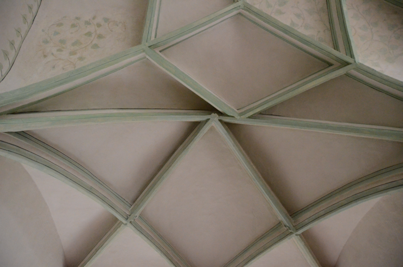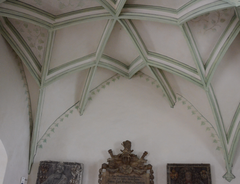 Ein weiteres Mariensymbol ist die dornenlose Rose, auf die die Blüten in den Schlusssteinen des Südflügels hindeuten.