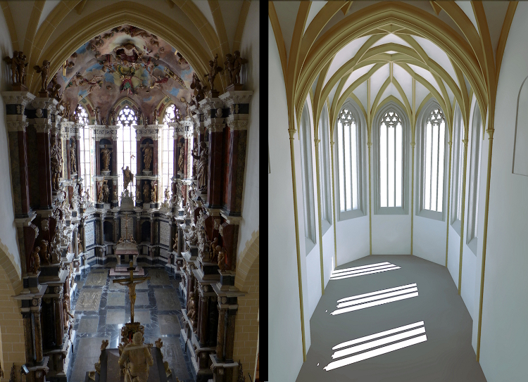 Was sich im Chor des Freiberger Domes nach der Umgestaltung um 1400 abspielte oder abspielen sollte, lässt sich heute nicht mehr genau sagen. Quellen, die uns Auskunft über die ursprüngliche Nutzung des Chores geben könnten, sind nicht überliefert. Aber die Architektur des Chores spiegelt wider, wie die Erzählung der Räume funktionierte: Ganz deutlich ist der Chor in zwei großzügige Teile gegliedert, die aber nicht vollkommen eigenständig sind. Der höhere Rang kommt dabei dem Ostchor als Ziel der Erzählung zu, dem sich der Vorchor als Weg dorthin unterordnet. Deutlich hat man im Rippennetz an der Decke die Stufe markiert, die zwischen beiden Teilen liegt. Außerdem errichtete man die Gewölbe in sehr hoher Qualität und griff auf die neuesten Entwicklungen unter Kaiser Karl IV. in Prag zurück. In Freiberg baute man also um 1400 im Stil des Kaisers und seiner großen Kathedrale, wenn auch in kleinerem Maßstab. Das alles deutet darauf hin, dass der Freiberger Chorneubau ein Projekt des Landesherrn Wilhelm I. gewesen ist, der in enger Verbindung zum Kaiser stand. Im besonderen Rahmen des Chores sollte wohl auch eine besondere Geschichte im Sinne Wilhelms erzählt werden. Diese Verbindung mit dem Heiligen Ort, so glaubte man, würde ihn seinem Seelenheil näherbringen und das sollte die Architektur auch sichtbar und erlebbar machen.