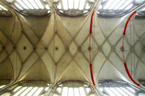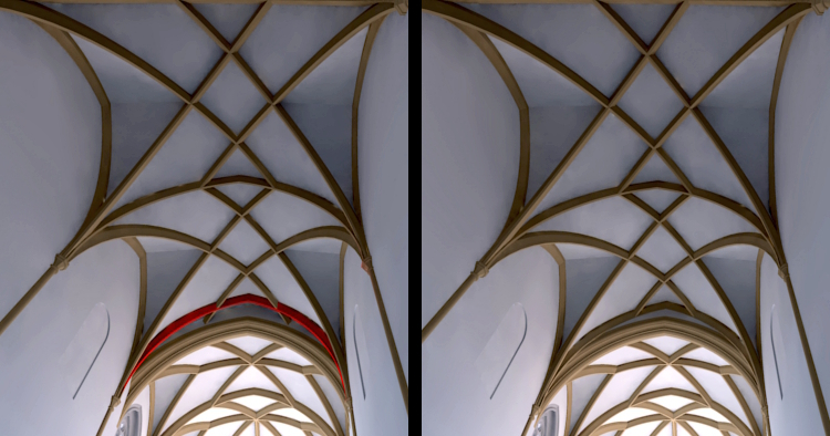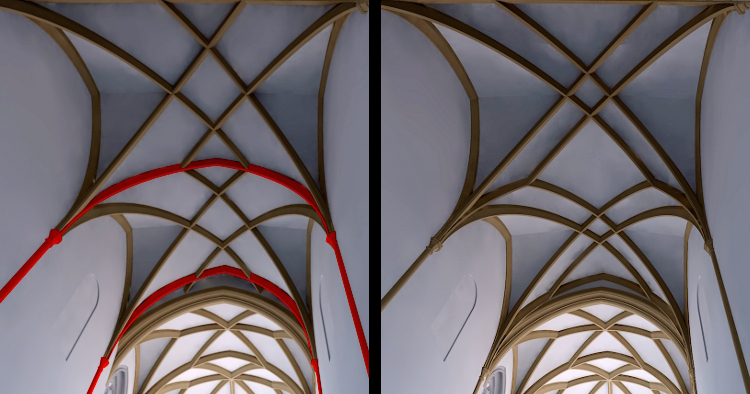 Wie die merkwürdige Störung im ursprünglichen Chorumbau um 1400 gewirkt haben könnte, wird noch deutlicher, wenn man sich das heute verdeckte Springrautengewölbe des Ostchores vorstellt. Gewölbe mit diesem Muster eignen sich durch ihre Geometrie besonders gut, das Gewölbenetz an den vieleckigen Ostabschluss des Chores anzuschließen.