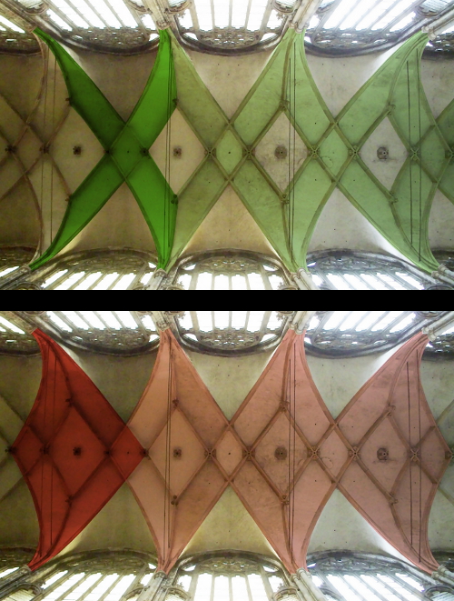 An Stelle der trennenden Gurte entstehen dabei große rautenförmige Flächen im Grenzbereich zwischen den Jochen, die sich im Muster des Gewölbes mit kleineren Rauten in der Mitte der Joche abwechseln. Dieses Muster setzt den Blick des Betrachters in Bewegung. Abwechselnd geben sich die Figur mit der kleinen Raute in der Mitte der Joche und die Figur mit der großen Raute zwischen den Jochen als Grundbausteine des Netzes zu erkennen. Ein solcher Baustein beinhaltet dabei den jeweils anderen zur Hälfte. Dieser Versatz lässt das Auge nicht zur Ruhe kommen und die Gewölbedecke kann als ein durchgehendes Ganzes wirken.