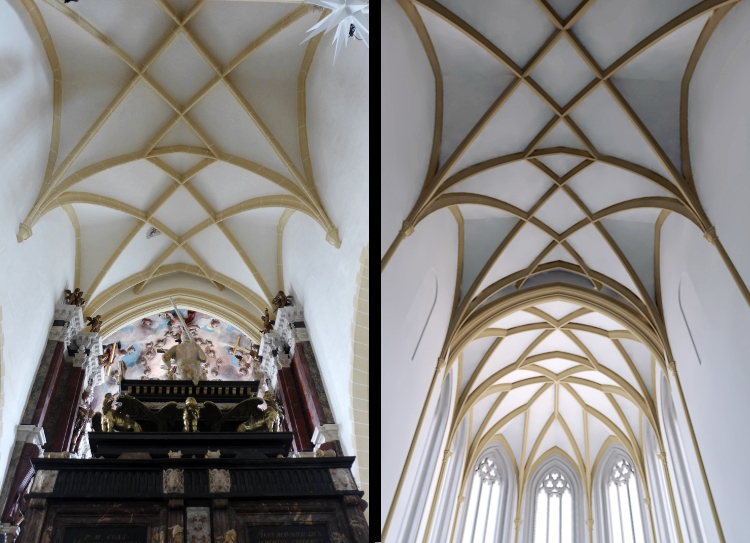 Auch die Gestaltung der Gewölbe in beiden Chorteilen reagiert auf die Trennung der Choranlage: In Vorchor und Ostchor wurde jeweils eine andere geometrische Grundfigur für das Rippennetz verwendet. Das Gewölbe des Vorchores folgt der Figur des so genannten Parallelrippengewölbes. Im Ostchor wurde ein Springrautengewölbe errichtet, das sich noch heute unter der reichen Renaissance-Decke befindet. Beide Gewölbetypen gehören zu den modernsten und anspruchsvollsten Lösungen, die in der Wölbkunst um 1400 möglich waren.