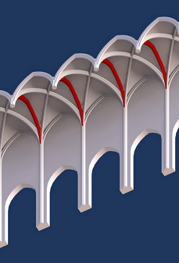 Ein Joch des Musters ist nämlich wie ein Ausschnitt aus einem achteckigen Gewölbestern aufgebaut. Damit lassen sich mehrere Springrautenjoche nacheinander zu einem Rippennetz anordnen, das dann stimmig in eine abschließende Sternfigur übergeht. So wie die Parallelrippenfigur uns als Betrachter mit auf einen Weg Richtung Osten nimmt, lässt uns das Springrautenmuster am Ziel im Osten ‒ am Ende der Erzählung ‒ ankommen.