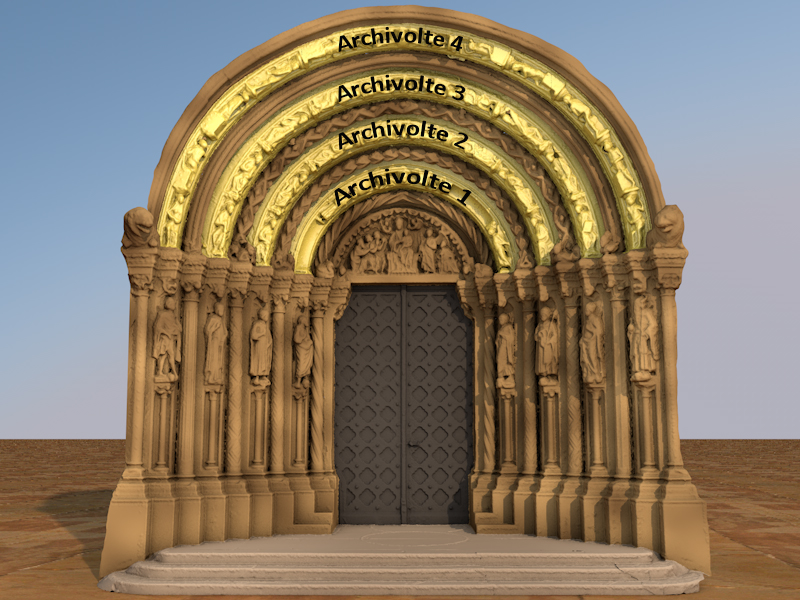 Die innerste Archivolte zeigt die Marienkrönung. Ein Engel trägt das Buch des Lebens in seinen Händen. Zwei Stellen sind nicht mehr wie ursprünglich mit Engeln besetzt, sie fehlen in der Engelschar. In der zweiten Archivolte übergibt ein fliegender Engel eine Seele in den rettenden Schoß Abrahams. Im Zentrum der dritten Archivolte steht die Taube des Heiligen Geistes. Sie wird von heranfliegenden Engeln verehrt und ist die Schlüsselfigur des Kollegiums der Apostel. Diese sind in dieser und der vorhergehenden Archivolte dargestellt. Die äußere Archivolte zeigt schließlich Menschen, die aus ihren Gräbern auferstehen. Sie bewegen sich von unten nach oben auf den Engel zu, der sie an sich zieht, um sie zu retten.