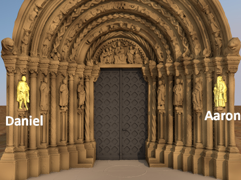 Die Gewändefiguren sind zwischen die Säulen in nischenartigen Kehlungen eingelassen und werden oben und unten von verschiedenen Tier- und Menschenköpfen eingefasst. Auf diese Weise stehen die Figuren in einem jeweils eigenen Raum und bilden im Ganzen eine Aussage. Links sind von außen nach innen dargestellt: der Prophet Daniel, die Königin von Saba, König Salomo und Johannes der Täufer. Auf der rechten Seite stehen: Aaron, Bathseba, König David und vermutlich der Evangelist Johannes.