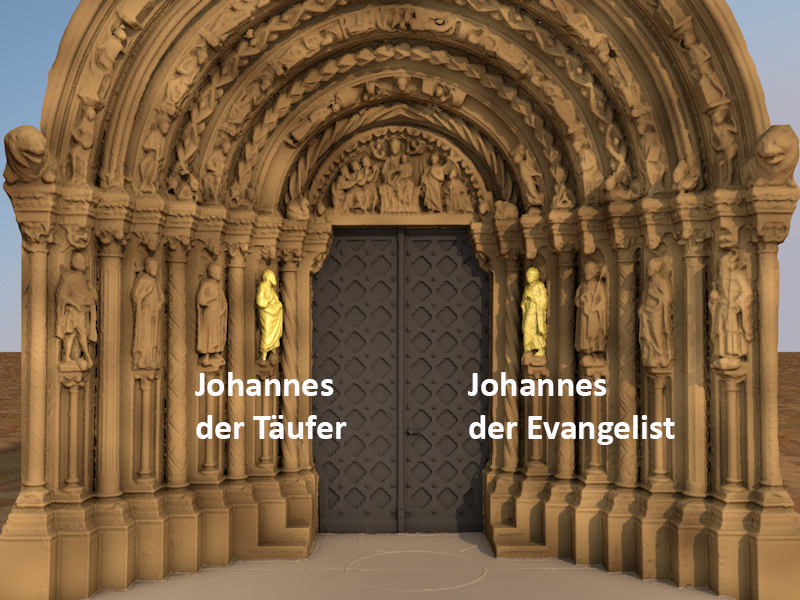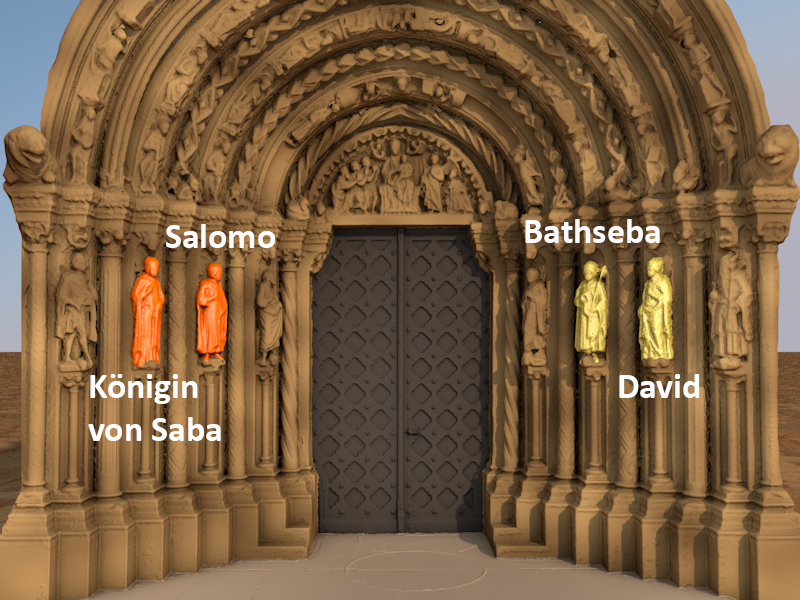 Mit Salomo, David, Johannes dem Täufer und dem Evangelisten Johannes sind in das Gewände Figuren eingelassen, die Vorfahren oder nähere Verwandte Marias und des Messias sind. Wenn nun im Mittelalter der Fürst bei seinem Einzug in die Kirche das Portal durchschritt, so gaben ihm die vorbildlichen Herrscher des Alten Testaments nicht nur ihr Geleit: Beim Hindurchgehen konnte sich der Fürst in die Nachfolge der biblischen Könige stellen.