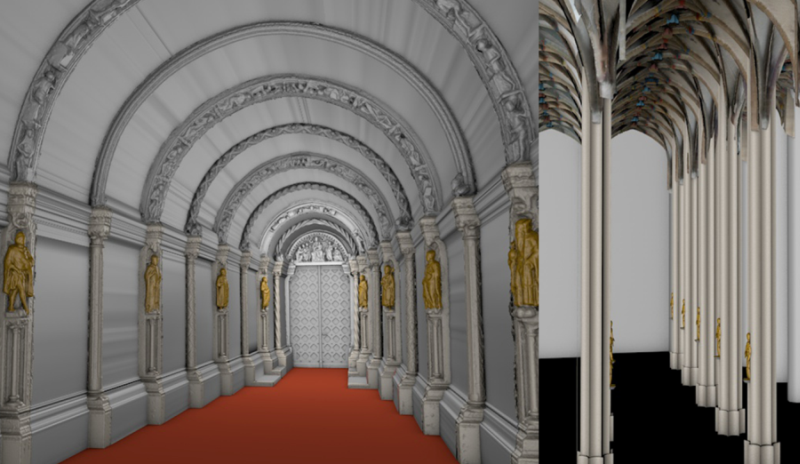 Von diesem Raumbild abgesondert ist die Anbetungsszene im Tympanon. Das Bildfeld wurde mit einem rahmenden Ornamentband eingefasst, ist damit von der übrigen Erzählstruktur abgelöst. Es erscheint als von hinten durchleuchtende Vision, als Auftakt der Vita Christi, als zugleich prophetisches wie historisches und gegenwärtiges Ereignis. Dieser Raum- und Zeitvorstellung entspricht auch die Raumsituation im Langhaus. Von Westen her sieht der Betrachter die Triumphkreuzgruppe und dahinter den Bühnen- und Bildraum des einstigen Marienchors. Der Durchblick über den Lettner, der einstigen Portalzone zum Chor, ließ den Betrachter verheißungsvoll auf den Tod Christi als Gnadenakt Gottes und die dahinterliegende künftige Erlösung und Aufnahme ins Himmelreich schauen.