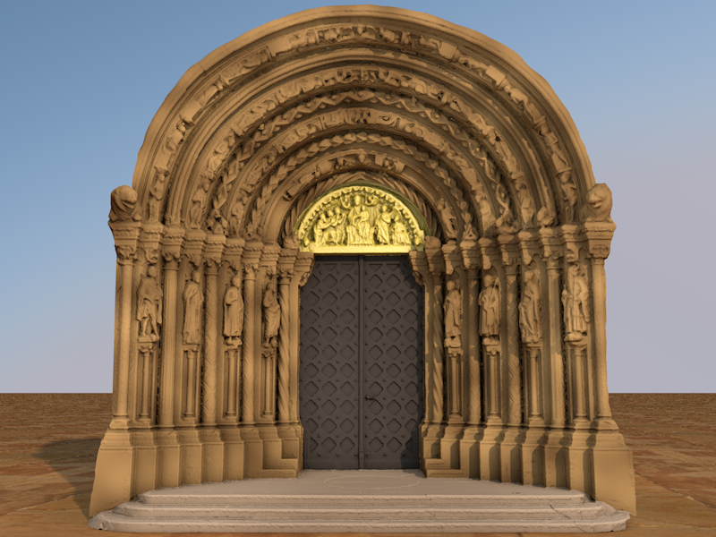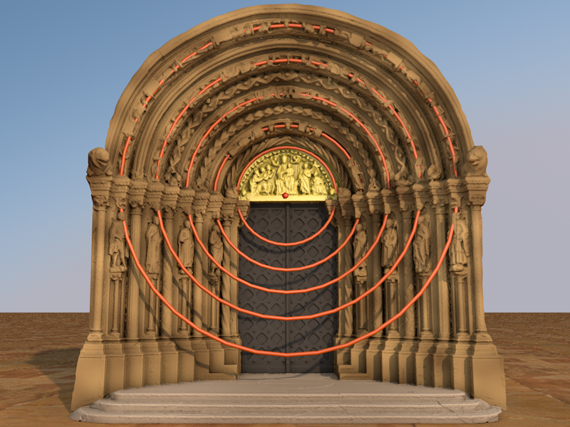 Durch die spiralförmig angeordneten Archivolten wird der Besucher schließlich dazu angeregt, seine Betrachterposition zu verlassen, die Stufen hinaufzusteigen, durch die Pforte hindurchzugehen und in das Innere der Kirche einzutreten. Die Sogwirkung des Portals wird durch die gleiche Höhe von Gewände- und Archivoltenzone erzeugt. Ihnen liegt die Figur des Kreises, der symbolisch für die gesamte Schöpfung steht, zugrunde. Sein Mittelpunkt befindet sich direkt unterhalb des Tympanons und unterstreicht damit das Gewicht des darin Dargestellten.