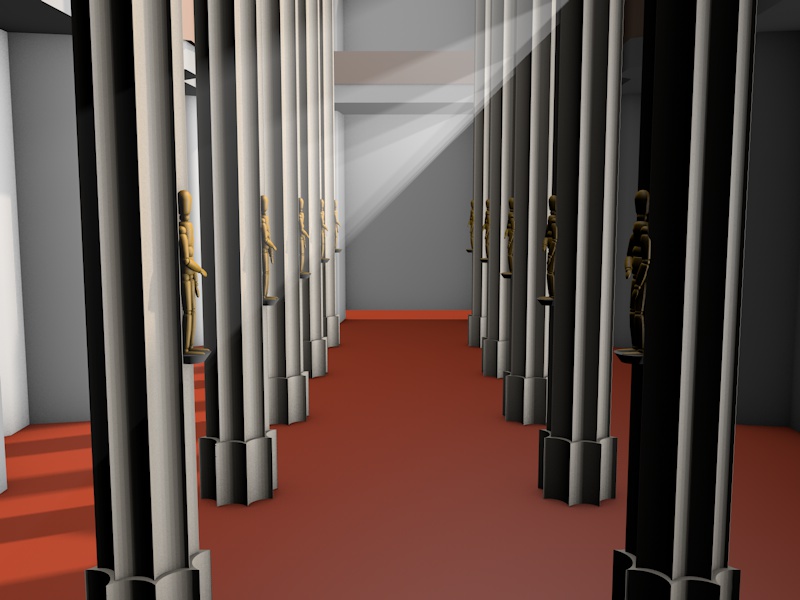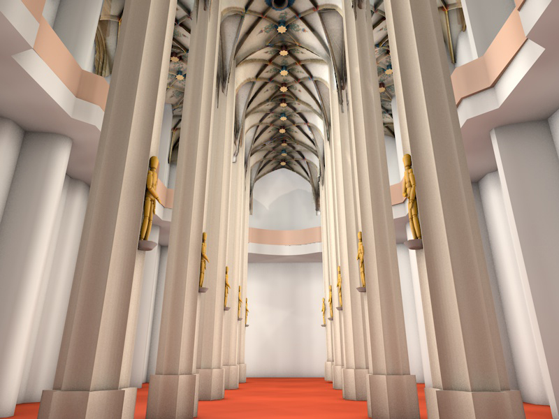 Die hohen Pfeiler, die sich beim Durchschreiten des Langhauses links und rechts des Betrachters wie mächtige rahmende Bäume nach oben erstrecken, begleiten den Betrachter bei seinem Gang bis zum Altarraum.
